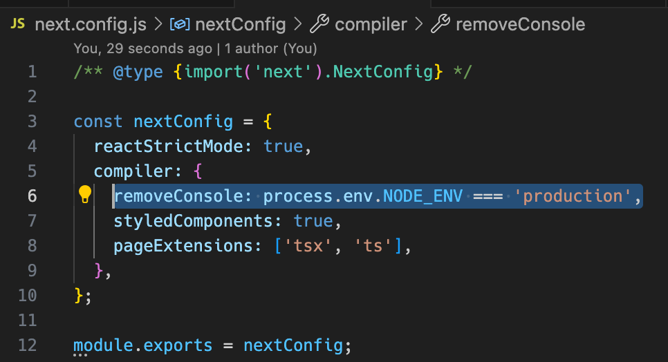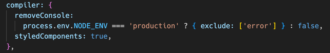 next.config.js 파일의 compiler에 아래와 같이 removeConsole 옵션을 주면 간단하게 해결된다.